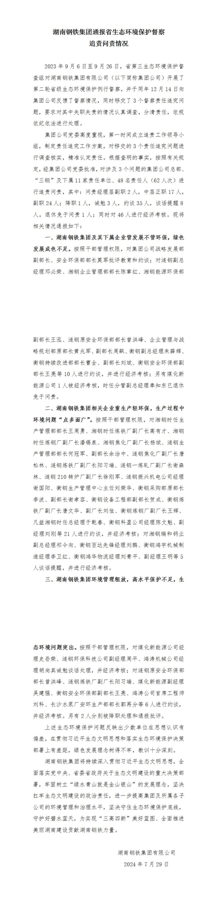 湖南鋼鐵集團(tuán)通報(bào)省生態(tài)環(huán)境保護(hù)督察追責(zé)問責(zé)情況
